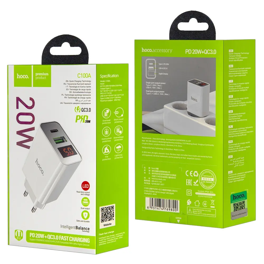 Переходник C100A СЗУ на USB QC3.0 + Type-C PD20W HOCO белый