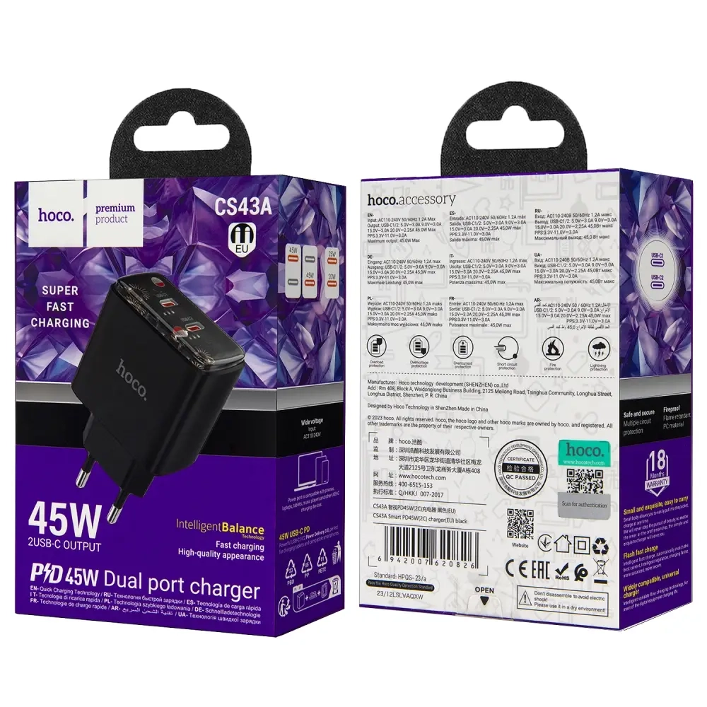 Переходник CS43A СЗУ на 2 Type-C PD45W HOCO черный