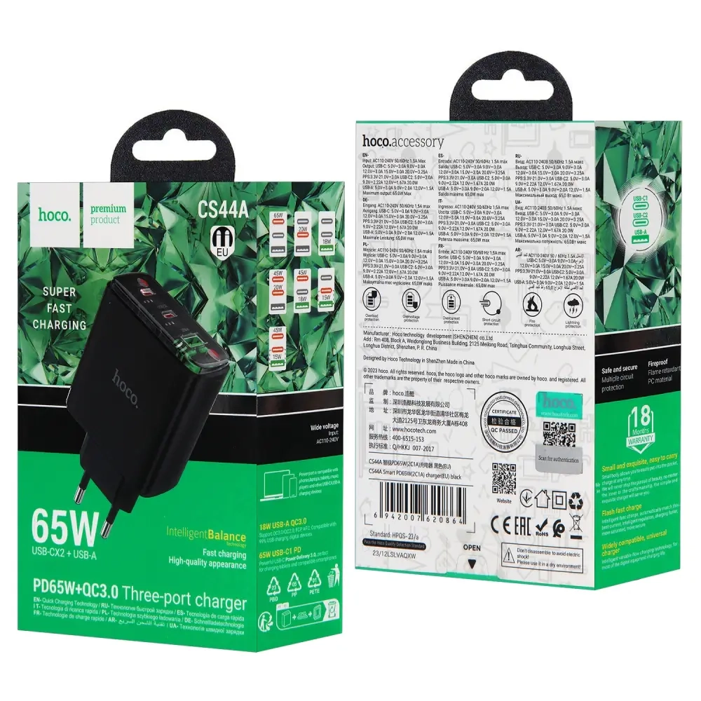 Переходник CS44A СЗУ на 2 Type-C PD65W HOCO черный