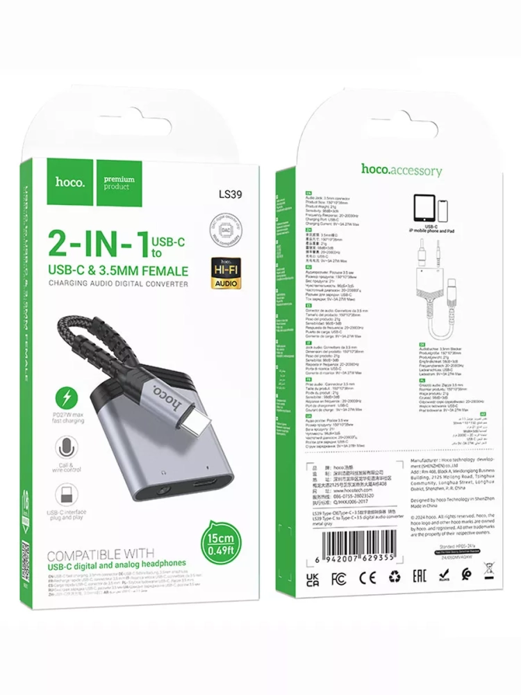 Hoco LS39 - это сверхсовременный цифровой аудиопреобразователь Type-C в Type-C + 3,5 мм, который станет незаменимым аксессуаром для аналоговых наушников. Почувствуйте мощь высококачественного звука в любом месте и в любое время.