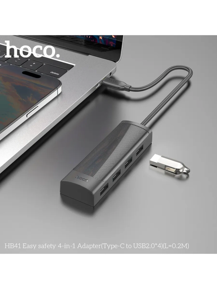 hoco HB41 - повзовляет подключить к устройствам имеюищм выход Type-C до 4 устройств с USB выходом. Обмен данными по всем портам происходит по технологии USB 2.0. Также благодаря данному хабу к примеру к смартфону можно подключить клавиатуру, мышь или тп.
