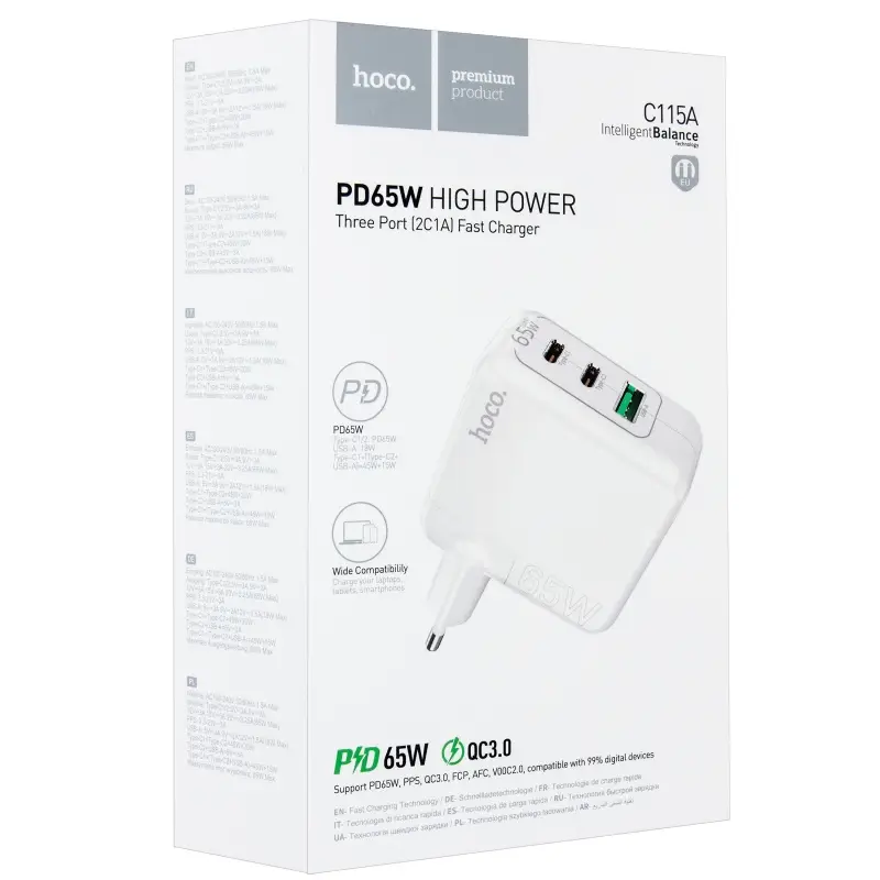 Переходник сетевого зарядного устройства на 2 Type-C PD65W + USB QC3.0 C115A HOCO черное
