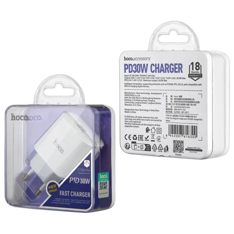 Переходник сетевого зарядного устройства на Type-C 30W C76A Pro HOCO белый