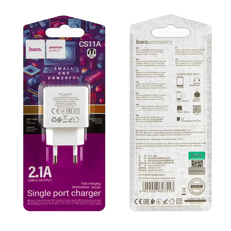 Переходник сетевого зарядного устройства на USB 2.A CS11A HOCO белый