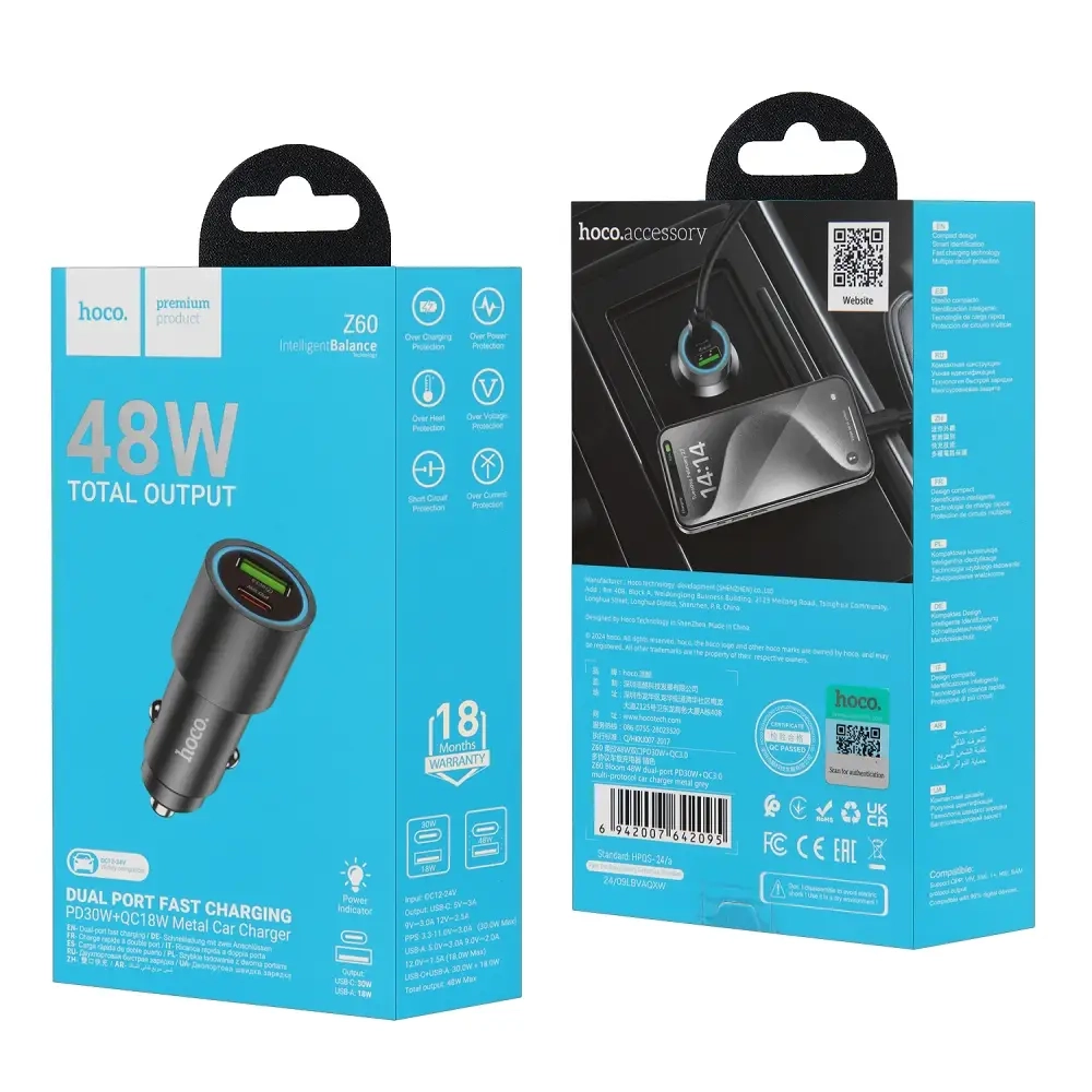 Переходник Z60 АЗУ на USB QC3.0 + Type-C PD48W HOCO темно-серый