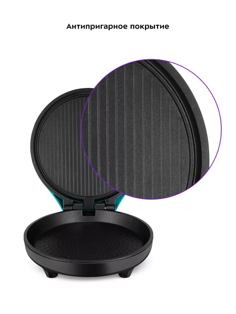 Антипригарное покрытие помогает не прилипать тесту и другим продуктам в процессе приготовления и позволяет готовить с минимальным количеством масла или без него. Также антипригарное покрытие панелей облегчает чистку, что особенно важно, так как панели являются несъемными. Прорезиненные ножки не дают прибору скользить по столу во время готовки.