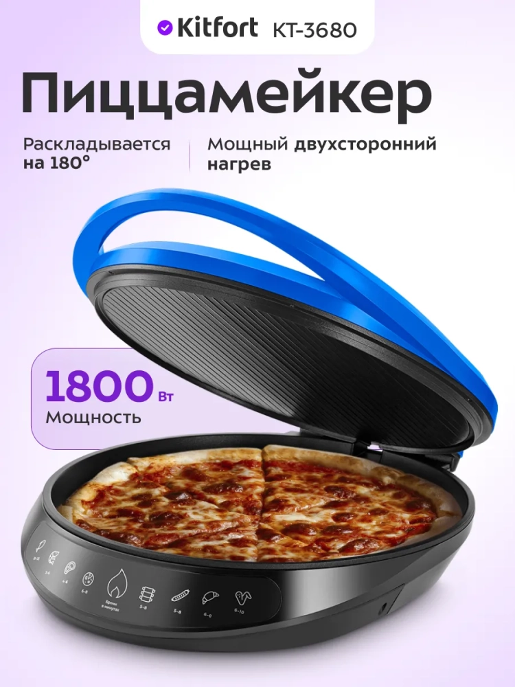 Пиццамейкер Kitfort KT-3680 — универсальное устройство, способное заменить духовку. Идеально подходит для приготовления большой пиццы, различных пирогов, сырников, горячих бутербродов и запеканок. Также в пиццамейкере можно готовить омлет, запеченные овощи, котлеты, мясо, рыбу и многое другое.