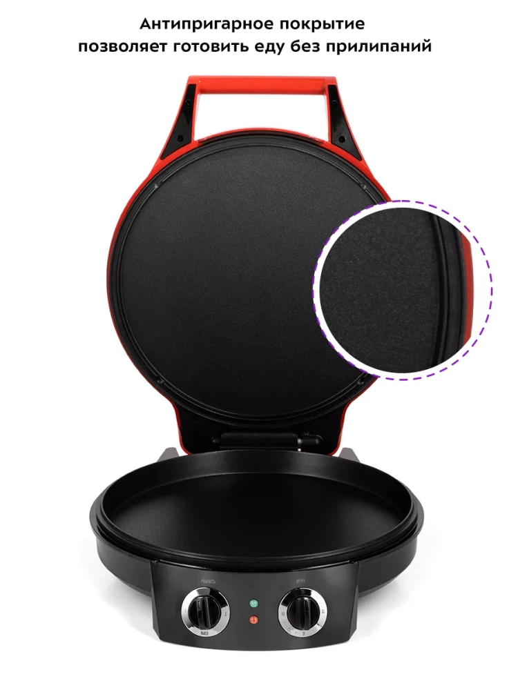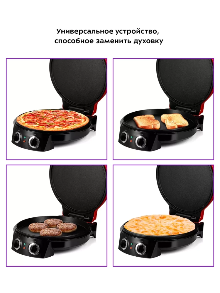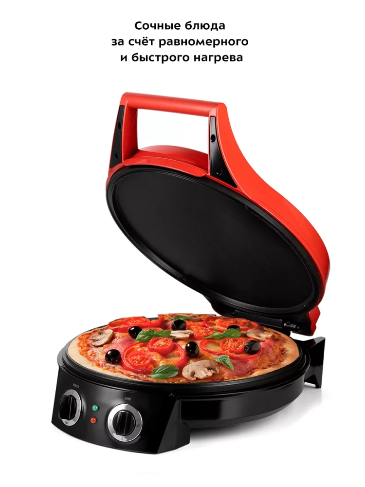 Печь оснащена антипригарным покрытием, что позволяет готовить с минимальным количеством масла и облегчает чистку. Это особенно важно, так как панели несъемные. Конструкция устройства позволяет использовать его в двух режимах: в закрытом состоянии для равномерного прогрева и в открытом, когда верхняя панель откидывается на 180°, превращая прибор в большую жаровню. Это делает пиццамейкер многофункциональной машиной для приготовления не только пиццы, но и омлетов, запеченных овощей, котлет, мяса и рыбы.