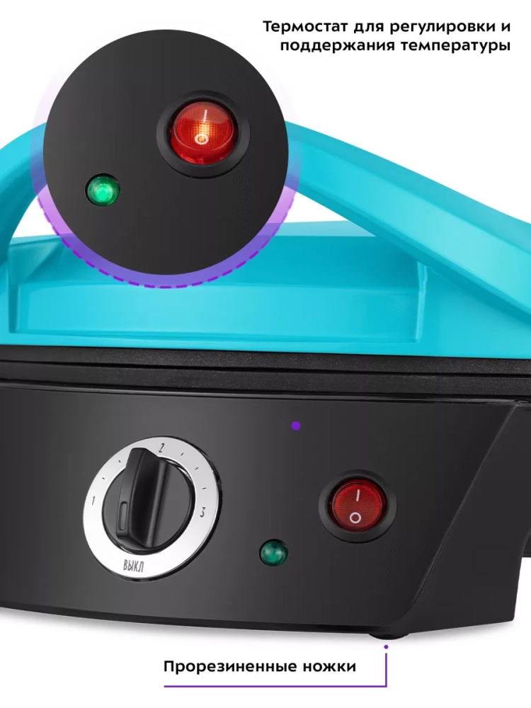 Антипригарное покрытие помогает не прилипать тесту и другим продуктам в процессе приготовления и позволяет готовить с минимальным количеством масла или без него. Также антипригарное покрытие панелей облегчает чистку, что особенно важно, так как панели являются несъемными. Пиццамейкер оснащен индикатором нагрева, термостатом для регулировки и поддержания температуры панелей. Прорезиненные ножки не дают прибору скользить по столу во время готовки.