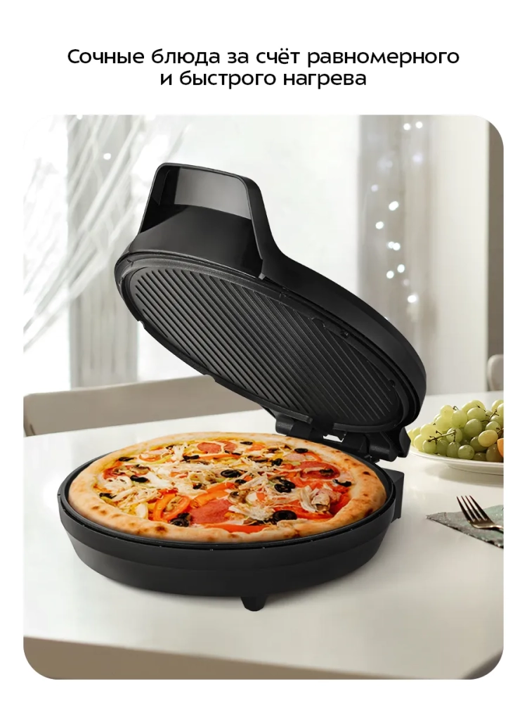 За счет нагревательных элементов в обеих панелях и небольшого пространства между панелями нагрев происходит быстро и равномерно. Поэтому блюда не пригорают снизу или сверху и хорошо пропекаются внутри. Благодаря равномерному нагреву пицца получается сочной со слегка хрустящей корочкой.