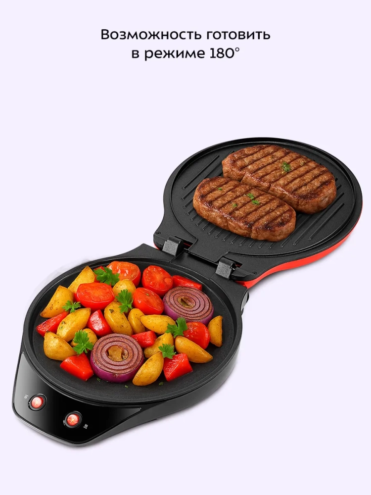 Конструкция пиццамейкера позволяет готовить в двух режимах: двустороннем и одностороннем. В двухстороннем режиме прибор закрывается крышкой. В одностороннем режиме верхняя панель откидывается на 180°, и пиццамейкер превращается в большую жаровню — для приготовления можно использовать обе панели. Панель в крышке прибора сделана ребристой: так при раскладывании на 180° вы сможете готовить продукты на ней, как на гриле.