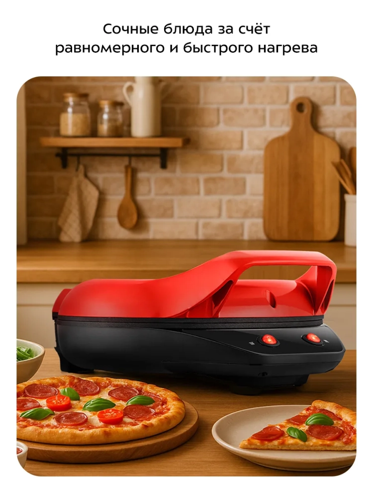 За счет нагревательных элементов в обеих панелях и небольшого пространства между панелями нагрев происходит быстро и равномерно, поэтому блюда не пригорают снизу или сверху и хорошо пропекаются внутри. Благодаря равномерному нагреву пицца получается сочной со слегка хрустящей корочкой.