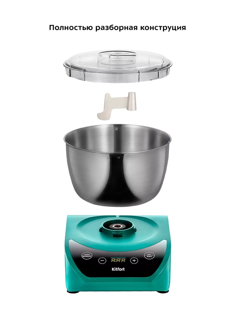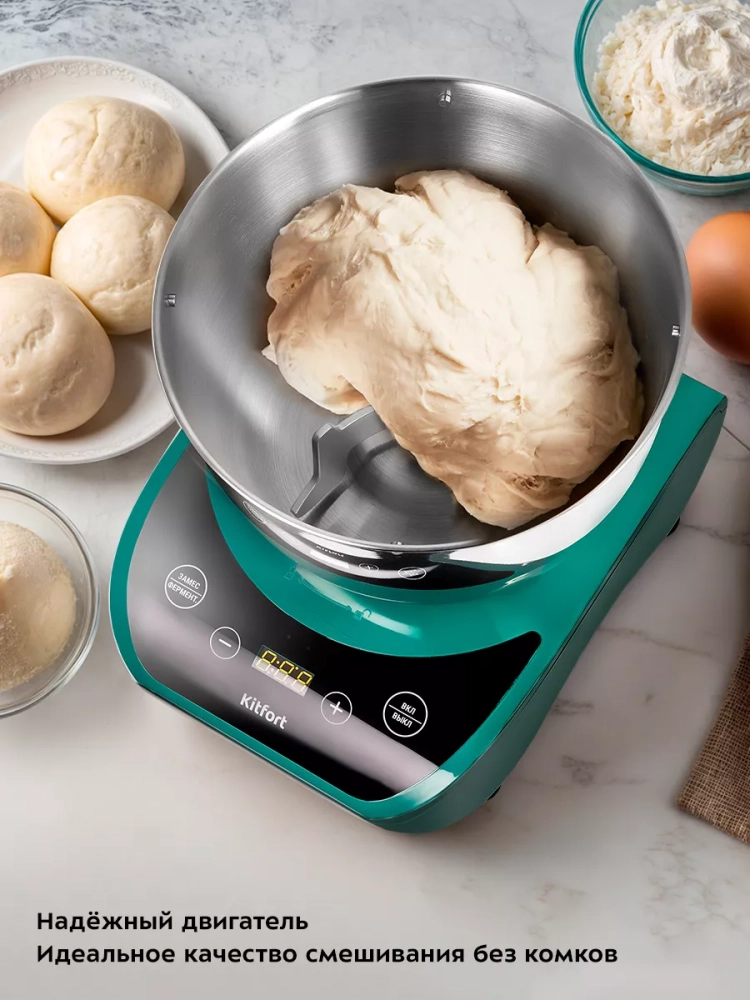Тестомесильная машина Kitfort КТ-3476 — это идеальный помощник для вашей кухни, который облегчит процесс приготовления теста. Этот профессиональный электрический прибор оснащен мощным двигателем на 550 Вт, что позволяет быстро и качественно замешивать тесто для пельменей, пирогов и булочек. Благодаря планетарному движению насадки, тесто смешивается в тестомешалке равномерно без комков. Эта кухонная техника имеет удобную сенсорную панель управления с дисплеем, где отображается время работы прибора. Вы можете выбрать автоматический режим работы: просто добавьте ингредиенты в чашу объемом 5 литров из нержавеющей стали и установите время замеса от 5 до 15 минут с шагом в 2 минуты. После завершения процесса прибор подаст звуковой сигнал. Чаша также подходит для расстойки теста благодаря функции нагрева от 30 до 40 °С. Это позволяет сахару и другим ингредиентам лучше взаимодействовать во время подъема теста. Время ферментации можно установить от 10 минут до часа и сорока пяти минут с шагом в десять минут. Прорезиненные ножки обеспечивают устойчивость прибора на столе во время работы, а защитная крышка предотвращает разбрызгивание ингредиентов при замешивании. Максимальное время непрерывной работы гаджета составляет пятнадцать минут; после этого рекомендуется дать мотору остыть не менее тридцати минут. Этот многофункциональный бытовой тестомес Китфорт станет незаменимым электро устройством на вашей кухне благодаря своей надежности и функциональности.
