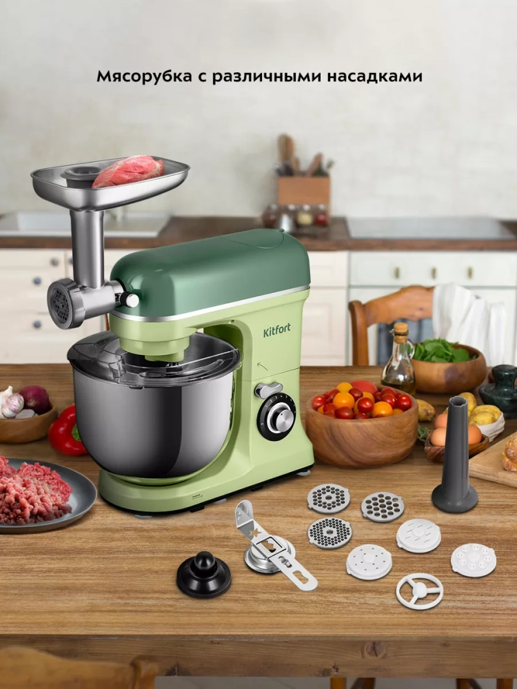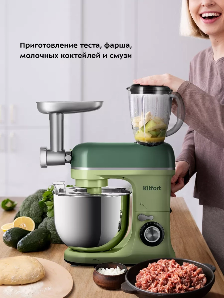 Многофункциональный планетарный миксер Kitfort КТ-3452 (3 в 1) поможет вам смешать ингредиенты, взбить яичный белок или сливки, приготовить картофельное пюре, соус, крем, мусс, замесить жидкое тесто для блинов и крутое — для пельменей и пирогов. В комплект также входит мясорубка и блендер, что превращает эту модель в универсальную кухонную машину «3 в 1».