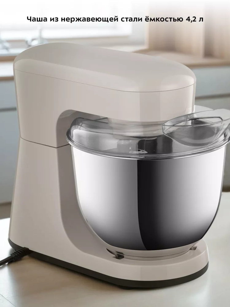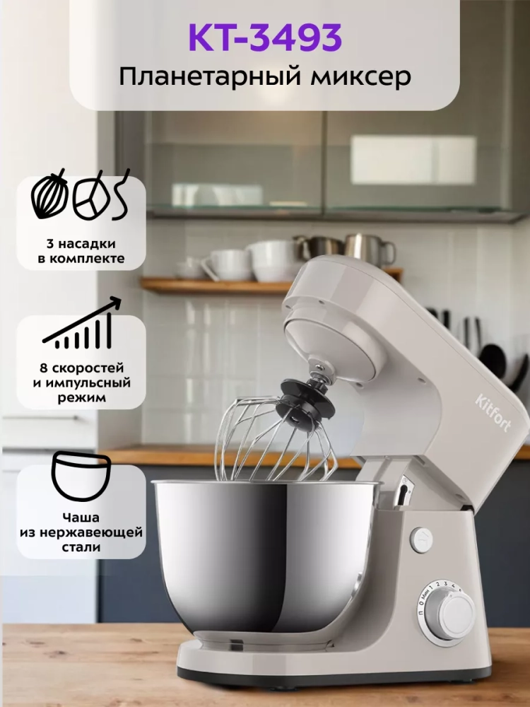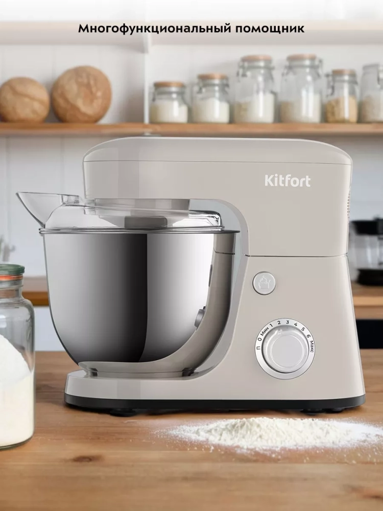 Планетарный миксер кухонный электрический Kitfort КТ-3493 — это многофункциональный прибор, который станет незаменимым помощником на вашей кухне. Этот мощный миксер позволяет легко смешивать ингредиенты, взбивать яичный белок или сливки, тесто для бисквита, а также готовить картофельное пюре, соусы и кремы. Благодаря планетарной системе смешивания насадка вращается вокруг своей оси и одновременно движется по окружности чаши, обеспечивая идеальное качество смешивания без комков. Миксер оснащен вместительной стальной чашей объемом 4,2 литра. Чаша изготовлена из нержавеющей стали и снабжена защитной крышкой с загрузочным отверстием для добавления ингредиентов во время работы. Это позволяет не прерывать процесс замешивания теста или приготовления других блюд. В комплект входят три насадки: венчик для взбивания яичных белков и жидкого теста; насадка для смешивания негустых ингредиентов; крюк для замешивания густого теста. Также в наборе есть лопатка и сепаратор для яиц. Электрическая тестомешалка Kitfort предлагает 8 скоростей работы мешалки и импульсный режим, что делает его универсальным инструментом на любой кухне. Прорезиненные ножки с присосками надежно фиксируют тестомесильный прибор на столе во время работы. Этот планетарный тестомес идеально подходит как для профессиональных кулинаров, так и для любителей домашней выпечки. Китфорт kitchen справится с задачами любой сложности — от простого взбивания до сложного замеса густого теста благодаря своей мощности.