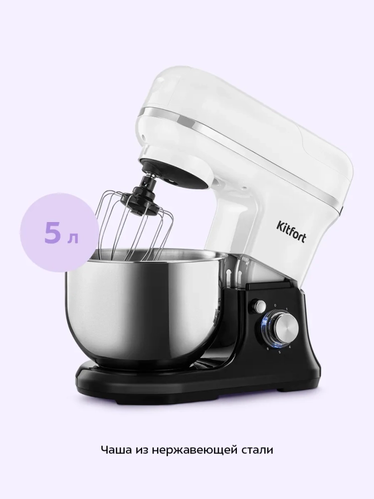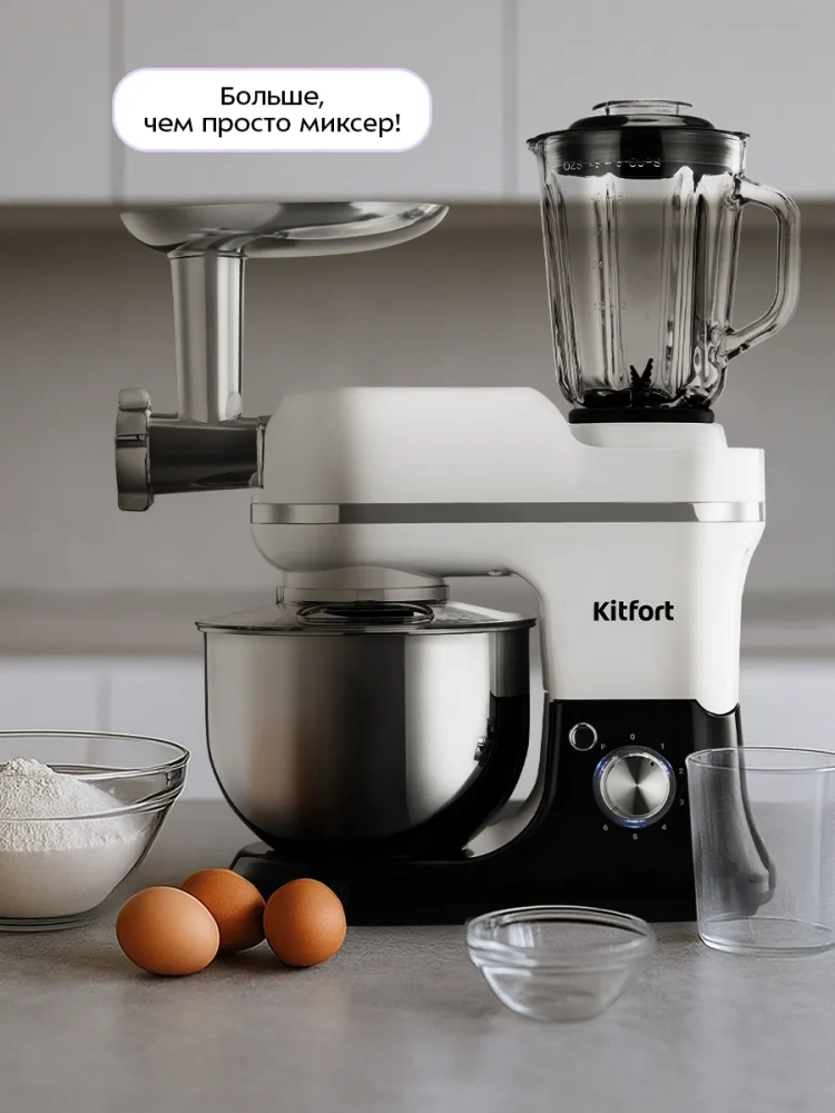 Многофункциональный планетарный миксер «3 в 1» Kitfort КТ-4420 поможет вам смешать ингредиенты, взбить яичный белок или сливки, приготовить соус, крем, мусс, замесить жидкое тесто для блинов и крутое — для пельменей и пирогов. Также он может перемолоть мясо на фарш и смешать фруктовые и фитнес-напитки, молочные коктейли и детское питание. В комплект входят мясорубка и блендер, что превращает эту модель в универсальную кухонную машину «3 в 1».