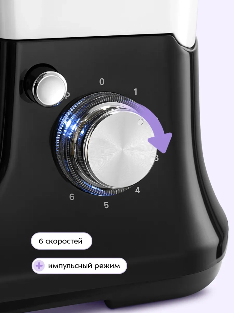 Скорость работы регулируется в процессе приготовления. У прибора 6 скоростей работы и импульсный режим, который позволяет замешивать ингредиенты на максимальной скорости с частыми паузами.