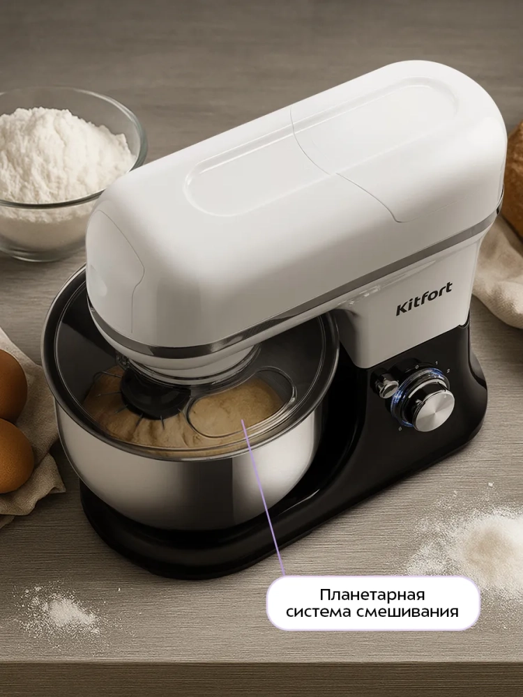 Миксер оснащен планетарной системой смешивания. Это обеспечивает идеальное качество смешивания без комков.