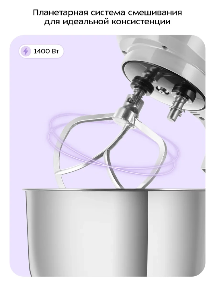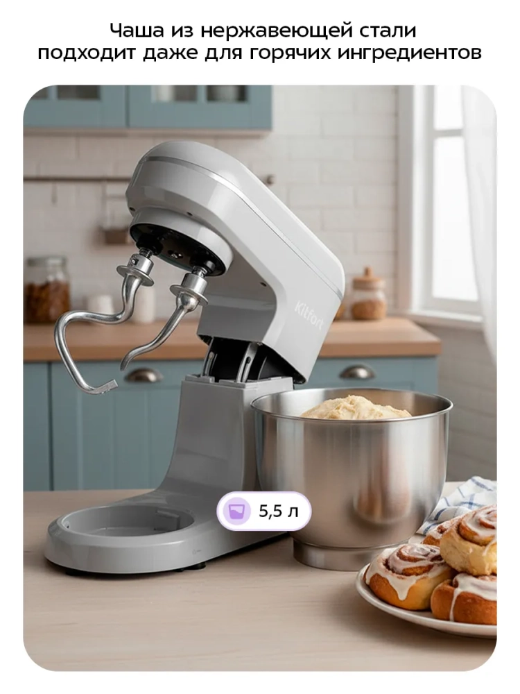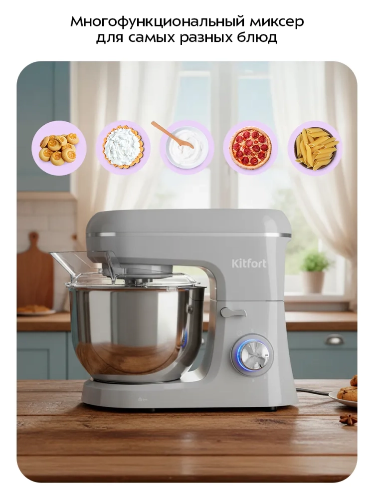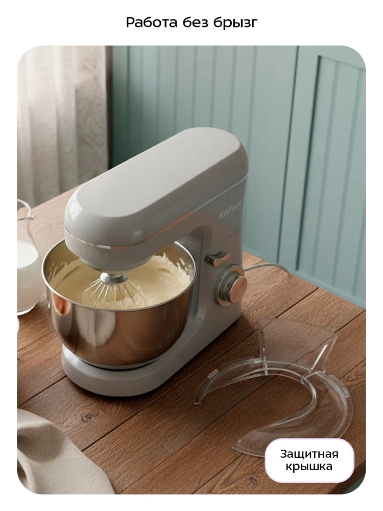 Планетарный миксер Kitfort КТ-4433 поможет вам смешать ингредиенты, взбить яичный белок или сливки, приготовить картофельное пюре, соус, крем, мусс, замесить жидкое тесто для блинов и крутое — для пельменей и пирогов.