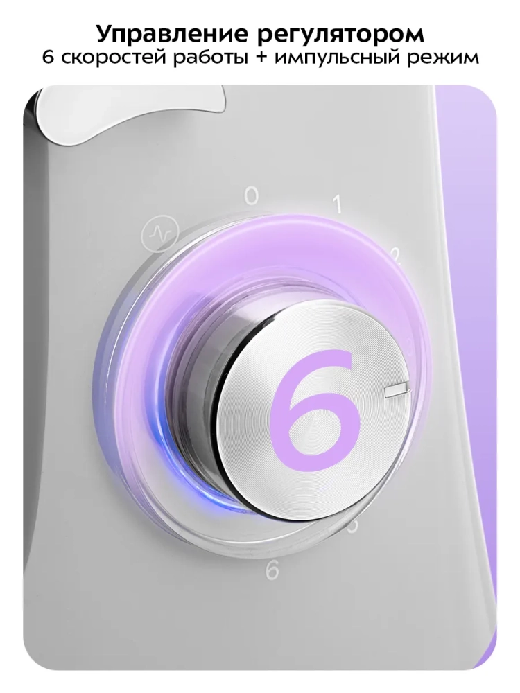При включении миксера скорость вращения регулируется, чтобы предотвратить разбрызгивание ингредиентов. У прибора 6 скоростей работы и импульсный режим, который позволяет замешивать ингредиенты на максимальной скорости с частыми паузами.