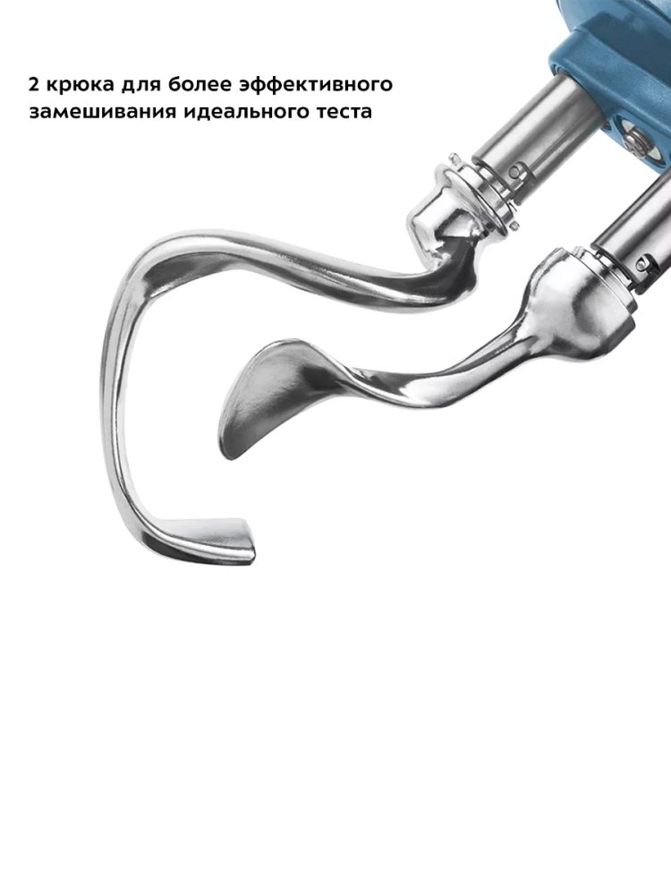 В комплекте идут насадки для взбивания, перемешивания и приготовления пюре, а также крюки для замеса тугого теста и защитный кожух от брызг, покрывающий насадки.