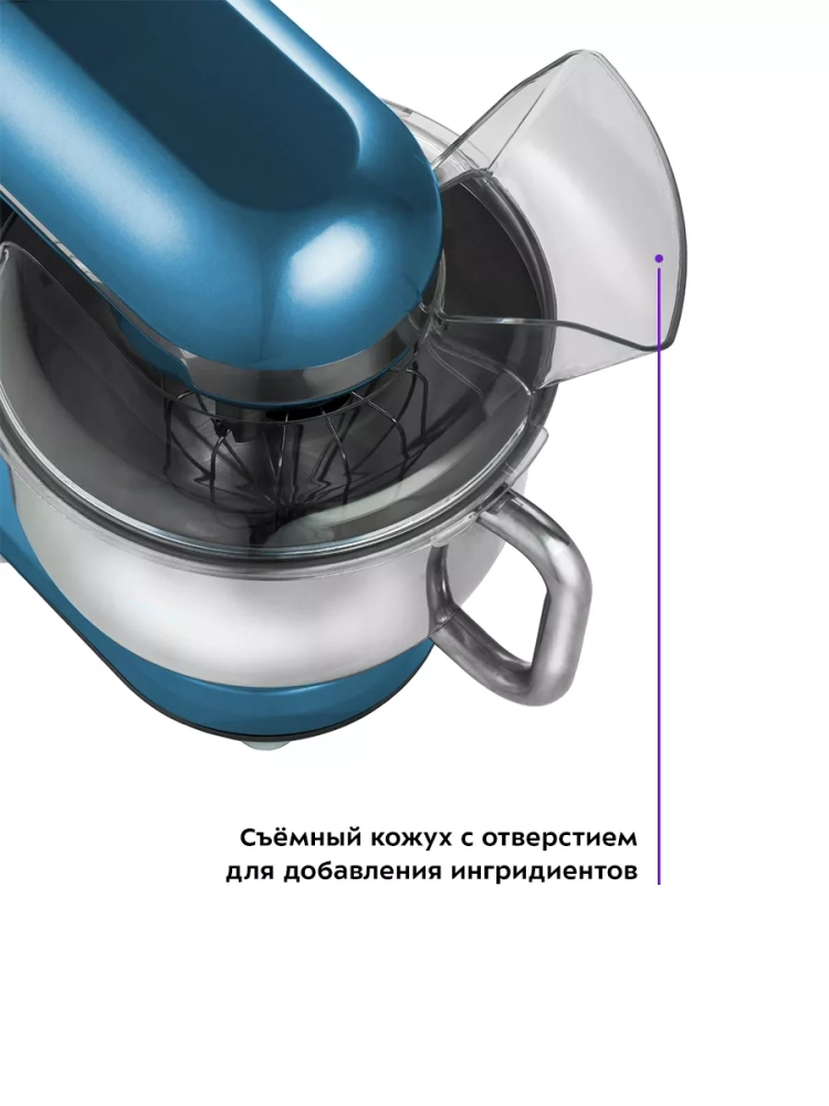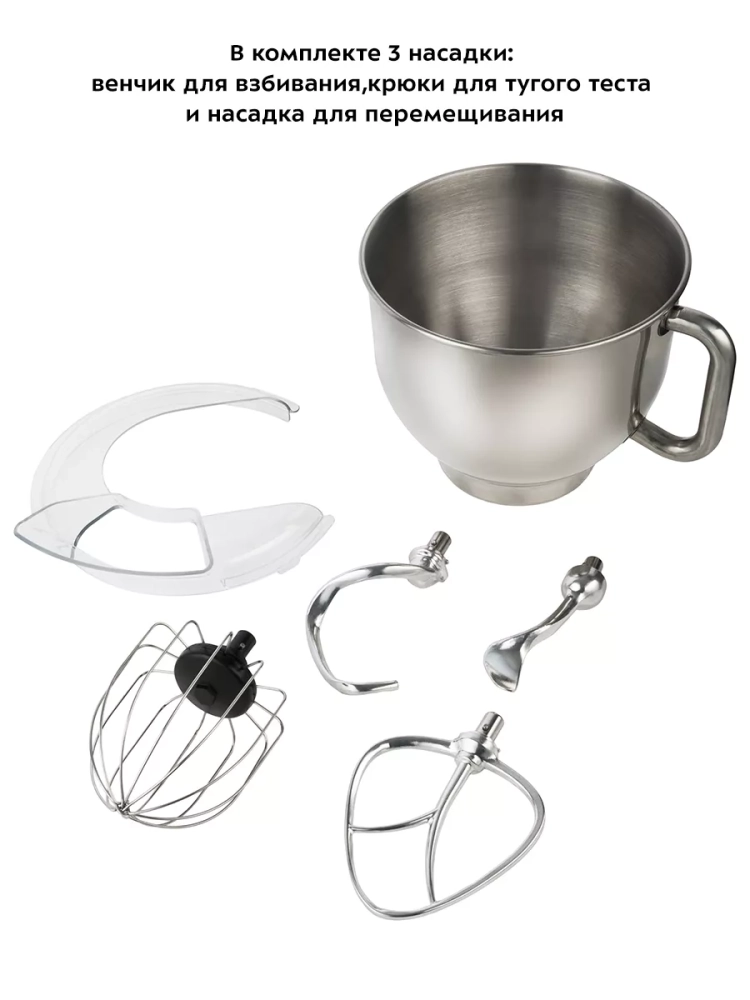 Миксер оснащен большой чашей объемом 5 литров. Форма насадок и чаши подобраны так, что при любом количестве продуктов насадка полностью снимет их с краёв и замешает.