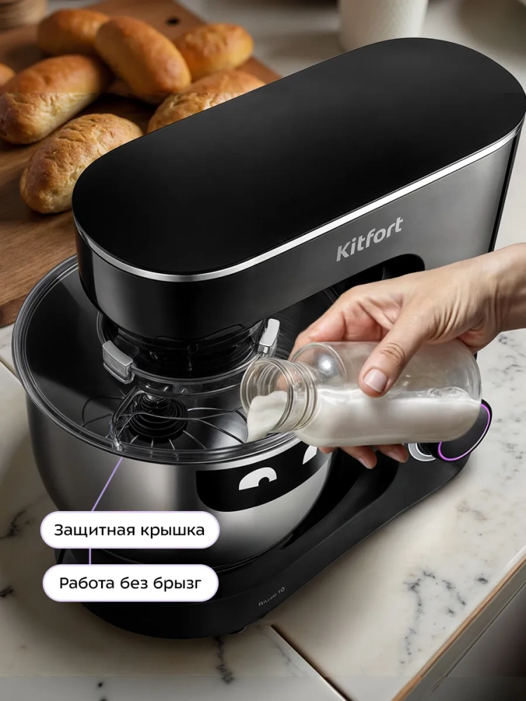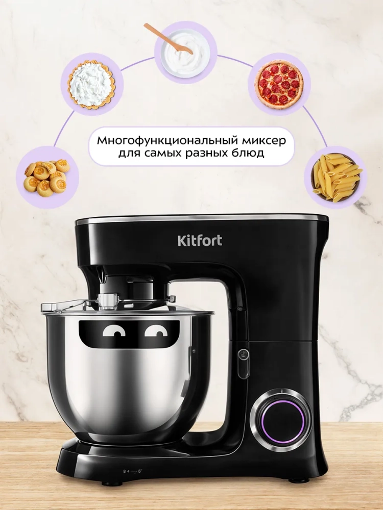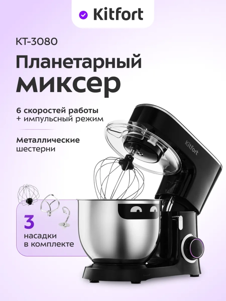 Планетарный миксер Kitfort КТ-3080 поможет вам смешать ингредиенты для любого блюда, взбить яичный белок или сливки, приготовить картофельное пюре, мусс, крем, соус, замесить жидкое тесто для блинов или крутое для пельменей и пирогов.