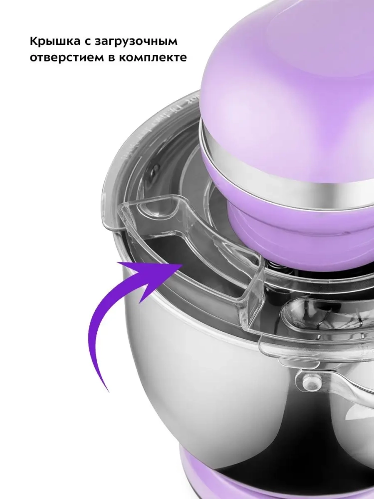 Чаша фиксируется на корпусе миксера и укомплектована защитной крышкой с отверстием. Крышка предотвращает разбрызгивание ингредиентов при замешивании. Добавлять ингредиенты во время работы можно через загрузочную горловину в крышке, не выключая миксер и не откидывая моторный блок.