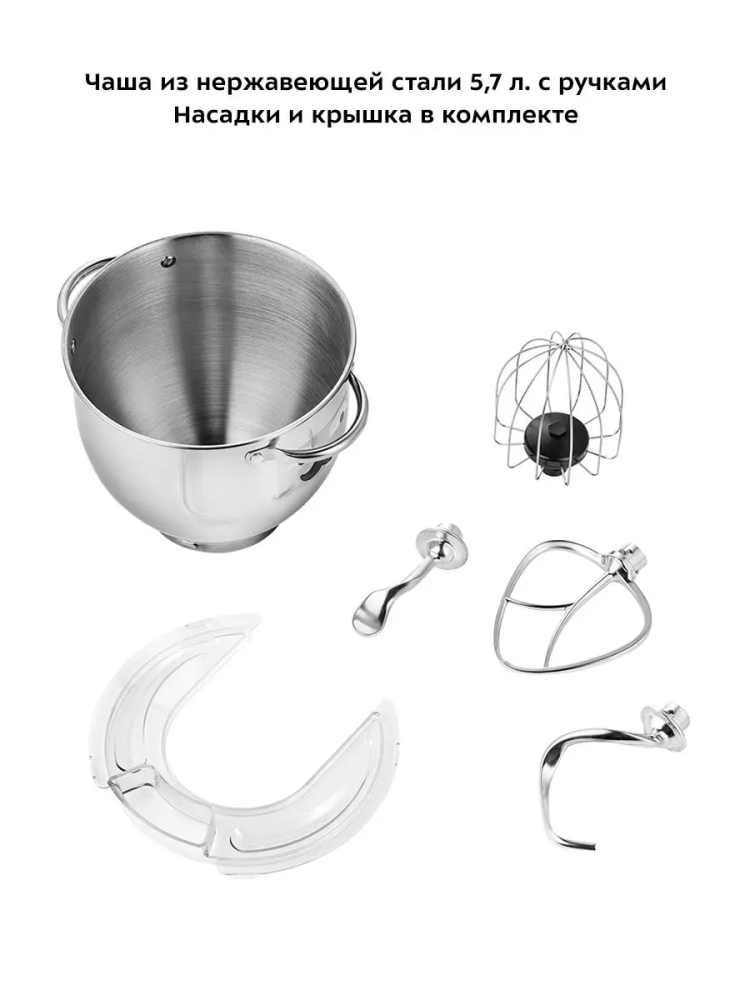 Миксер оснащен большой чашей из нержавеющей стали емкостью 5,7 литра.