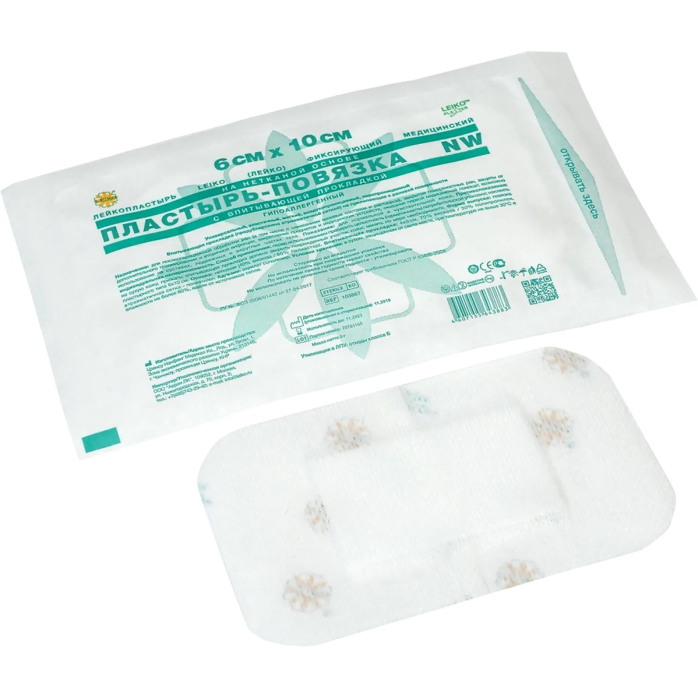 Пластырь-повязка неткан основа впит подушка 6x10см LEIKO