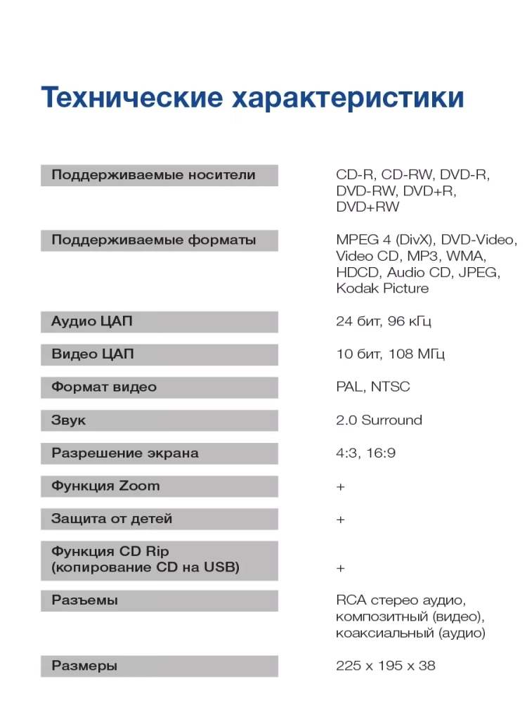Прибор воспроизводит данные с USB-накопителей и пяти типов компакт-дисков. Качественное звучание гарантирует система Dolby Digital 2.0. Приставка идет в комплекте с пультом ДУ для удобного управления функционалом и настройками. Плеер аккуратно впишется на полку под ТВ на тумбе или кронштейне.