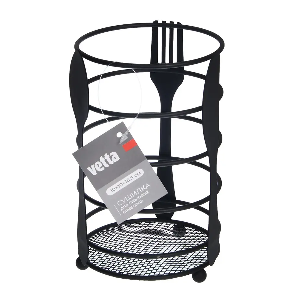 Сушилка для столовых приборов VETTA «Кухня» — это удобная металлическая подставка для ложек, вилок и столовых ножей, которая может одновременно использоваться в качестве места для хранения столовых приборов, так и для их сушки. Сушилка оснащена устойчивыми ножками, а также отверстиями в нижней части для стекания воды. Тематический дизайн будет оригинально смотреться в интерьере кухни. Изделие имеет качественное покрытие и не подвержено коррозии. 2 классических цвета в ассортименте.