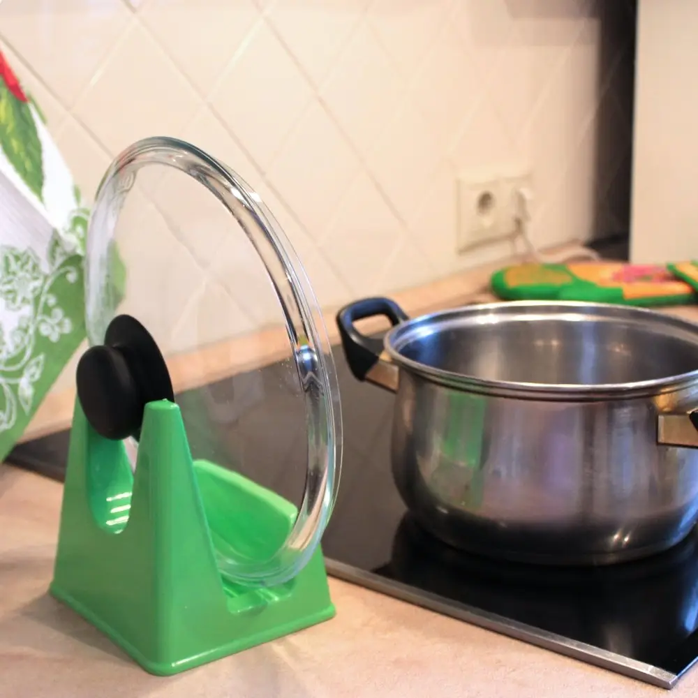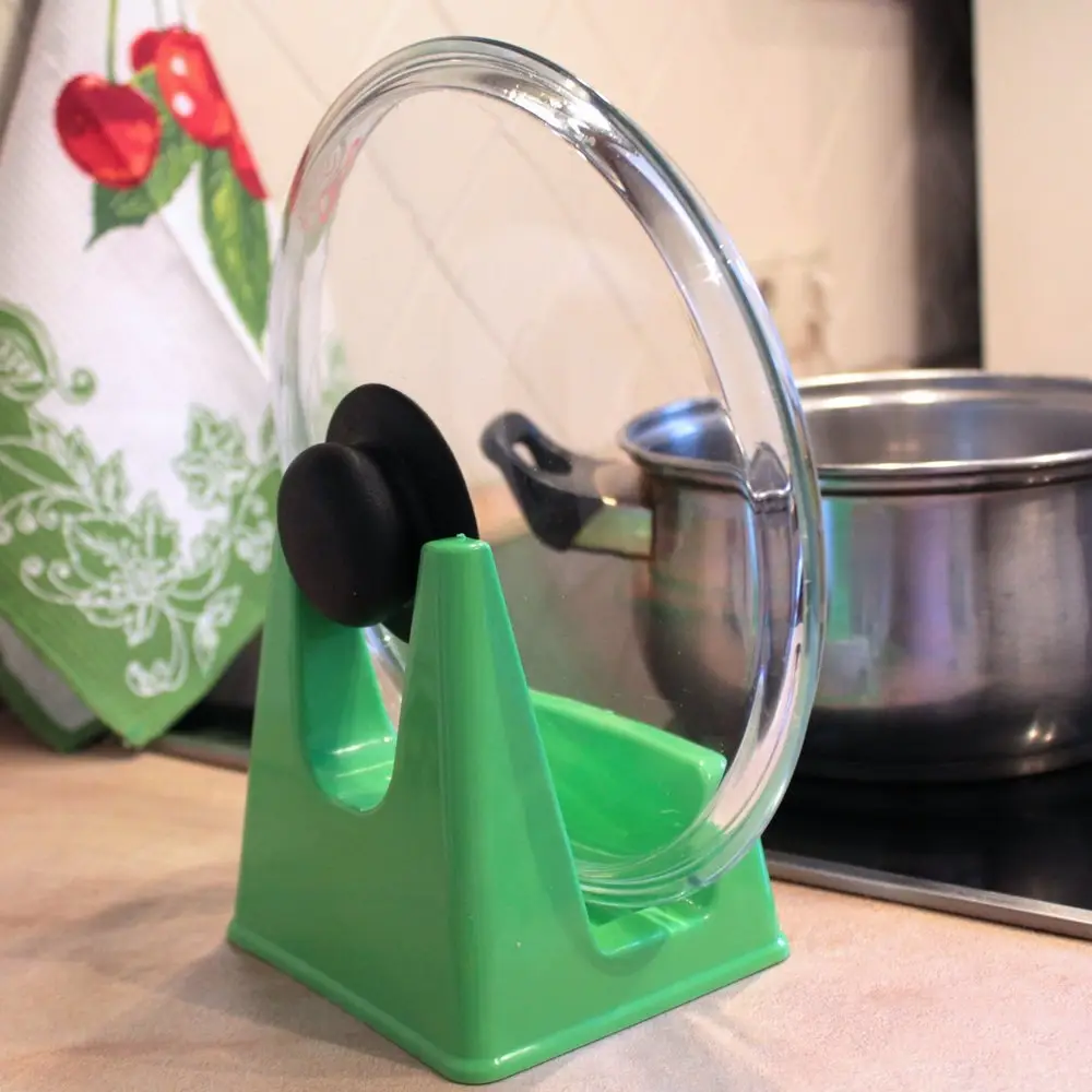 Подставка под крышку выручит вас во время приготовления пищи или раскладывания блюд по тарелкам. Вы наверняка не раз сталкивались с проблемой, куда положить горячую крышку, снятую с кастрюли или сотейника. Ставьте ее вертикально на подставку и не беспокойтесь о собравшихся испарениях – вода стечет на дно изделия, а не на стол. 2 цвета - желтый и голубой. Размер 12,7х11х12,4 см.