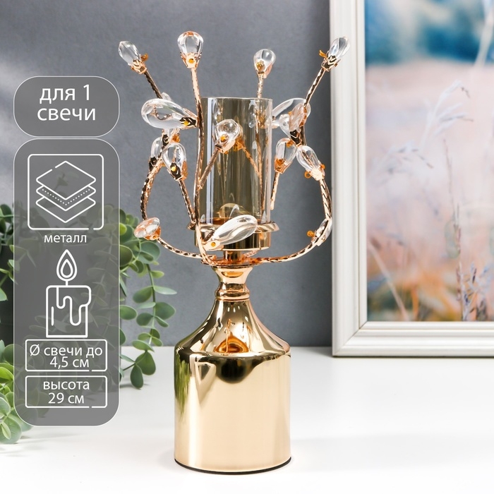 Подсвечник металл на 1 свечу "Веточки с кристаллами. Колонна" золото 29х15х15 см