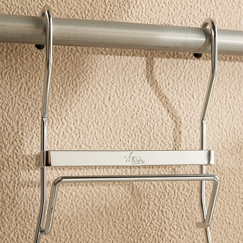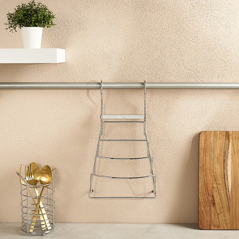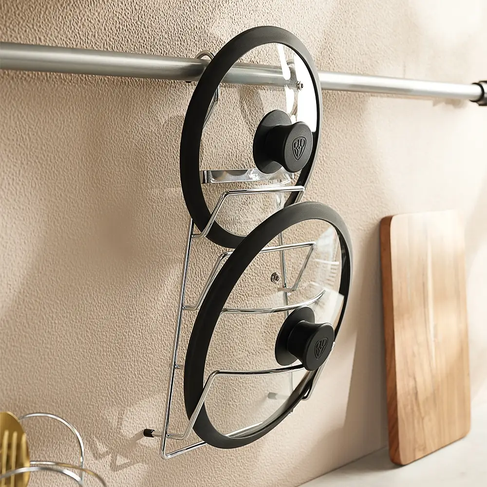 Держатель для крышек подвесной навешивается на рейлинговую перекладину или дверь, вмещает до 4-х крышек. В специальных отделениях конструкции размещаются крышки для подручного хранения на кухне. Размер: 21x11x37 см.