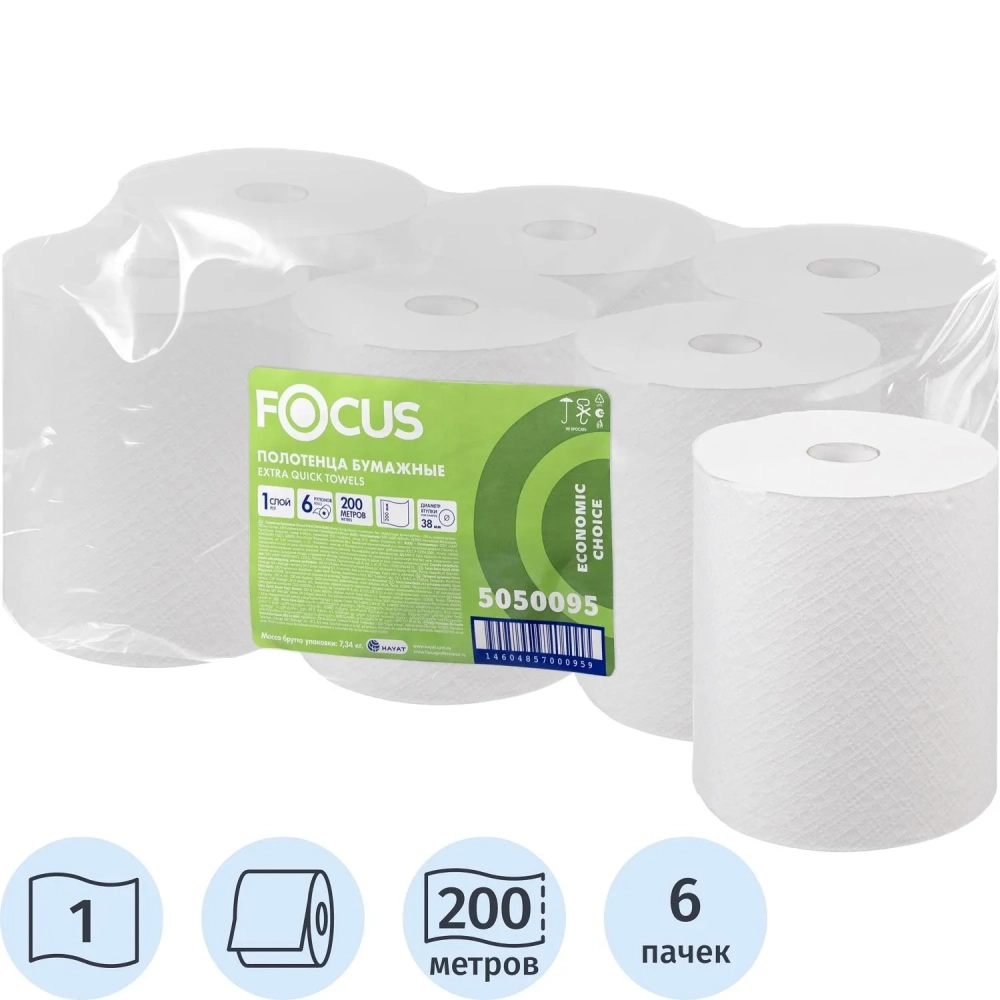 Полотенца бумажные д/дисп. FOCUS Extra Quick 1сл 200м 6рул/уп цел 5050095
