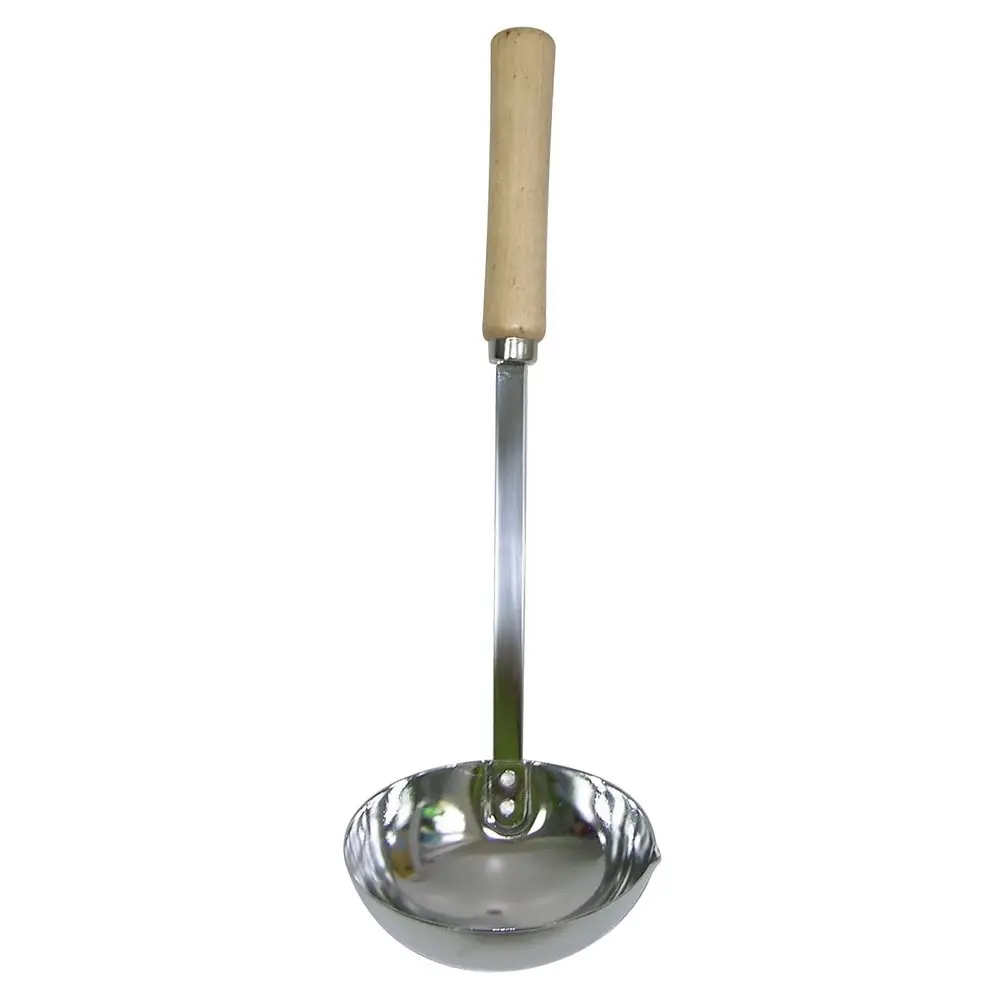 Кухонный половник – незаменимое приспособление для разливания супов, морсов, компотов. Инструмент используется для дозировки теста при выпечке блинов. Половник «Ретро» имеет простую конструкцию – металлическую чашу с носиком и длинную ручку с деревом. Деревянная поверхность не нагревается, удобно лежит в руке. После использования достаточно промывать изделие с моющими средствами. Хромированный металл не портится со временем и не ржавеет, деревянная ручка приятна на ощупь и не нагревается. Половник для кухни выполнен в знакомом всем ретро дизайне, подойдет практически к любому интерьеру. Длина 28 см, объем 125 мл.