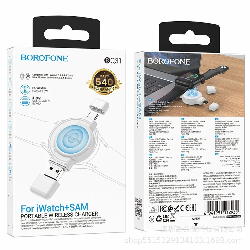 Борофон BQ31 - это портативное устройство, которое делает зарядку ваших смарт-часов Apple Watch и Samsung Galaxy Watch максимально удобной и простой. Совместимость с Apple Watch 1-9, Ultra, SE и Samsung Galaxy Watch 1-5 гарантирует, что вы всегда будете на связи. Эта зарядка поддерживает стандартный протокол QI и оснащена функциями безопасности, чтобы защитить ваши устройства.