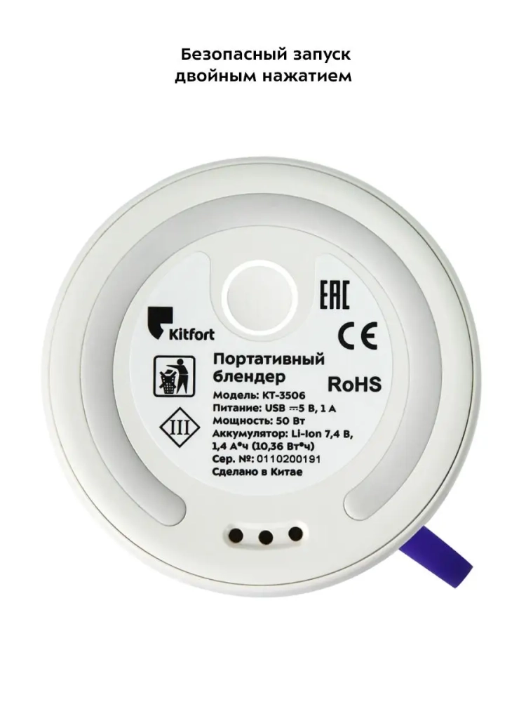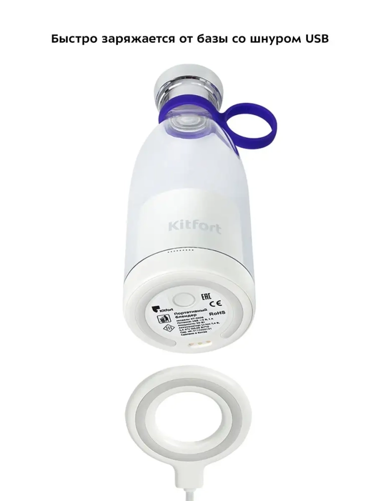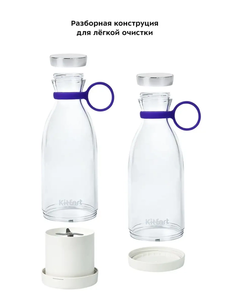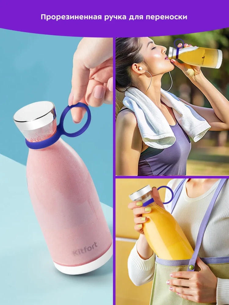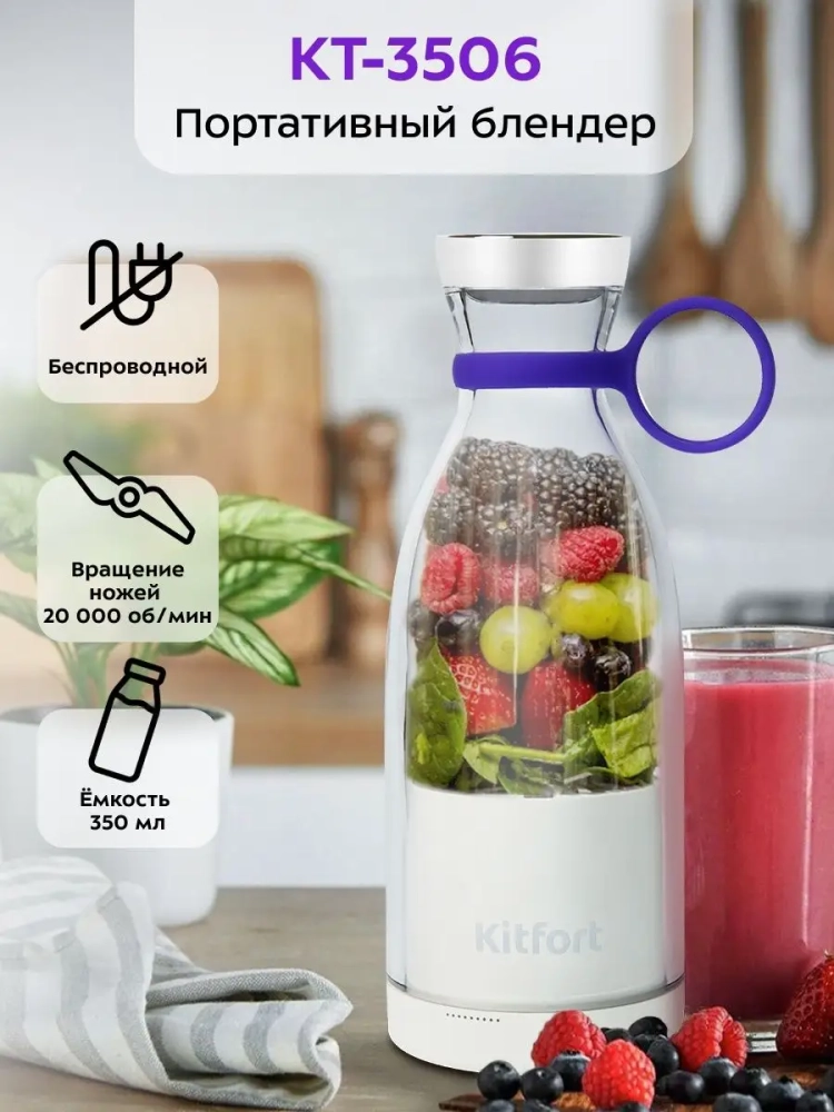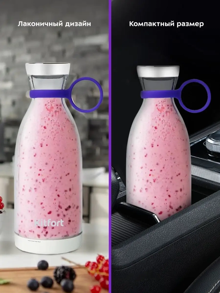 Портативный блендер Китфорт КТ-3506 — оптимальное устройство для любителей свежих коктейлей и смузи. С его помощью в любом месте: на работе, в спортивном зале, в машине, на отдыхе, на пикнике, во время прогулки у вас есть возможность приготовить здоровый и вкусный коктейль. Для этого нужно заполнить ингредиентами бутылку и включить блендер. Прибор компактный и не займет много места в спортивной сумке или рюкзаке.