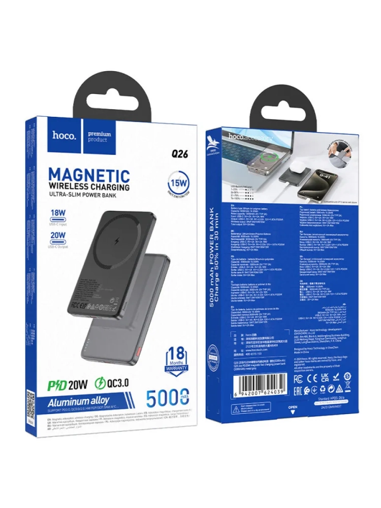 Ультра тонкий повербанк 5000. Повербанк с MagSafe — мощная беспроводная зарядка для iPhone и других устройств. Магнитная фиксация MagSafe работает с iPhone 12 и новее, как с чехлом MagSafe, так и без него. Также поддерживается беспроводная зарядка любых устройств, совместимых со стандартом Qi — при использовании магсейф - чехла. Скорость беспроводной зарядка до 15w. 1 светодиод: 1-25% 2 светодиода: 26-50% 3 светодиода: 51-75% 4 светодиода: 76 - 100%