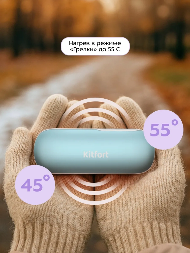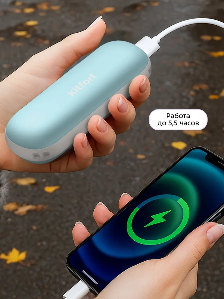 Повербанк-грелка Kitfort KT-2722 поможет согреть руки, ноги, прогреть обувь или одежду в холодное время года. Кроме того, устройство может работать как внешний аккумулятор (повербанк) для зарядки сторонних устройств. Прибор работает или как грелка, или как повербанк. Компактный размер грелки позволяет брать ее с собой и использовать в любом удобном месте.