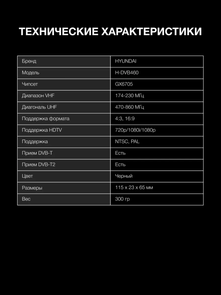 Приставка для цифрового телевидения Hyundai H-DVB460 поддерживает стандарты DVB-T (эфир), DVB-T2 (эфир) и DVB-C (кабельное), что обеспечивает высокую четкость и яркость изображения для непревзойденного опыта просмотра. Благодаря возможности воспроизведения файлов, вы сможете наслаждаться различными медиа-контентом - от фильмов и сериалов до музыки и фотографий - прямо на экране телевизора.