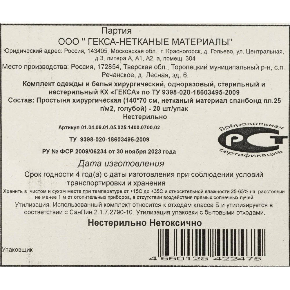 Простыня н/с 140х70см спанбонд пл.25, голубая, 20шт/уп Гекса