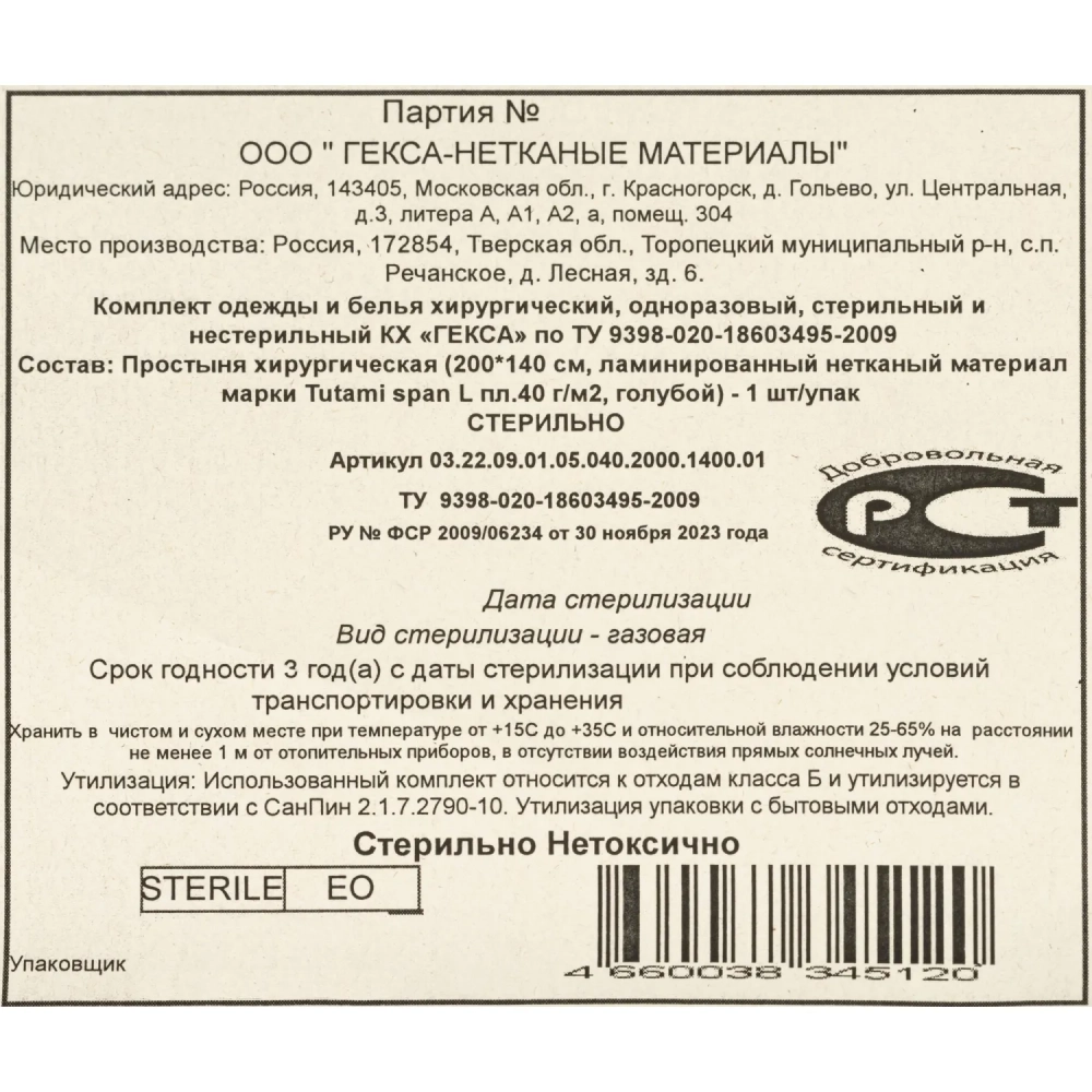 Простыня стер. 200х140см спанбонд лам. пл.40, 1шт/уп Tutami span L Гекса