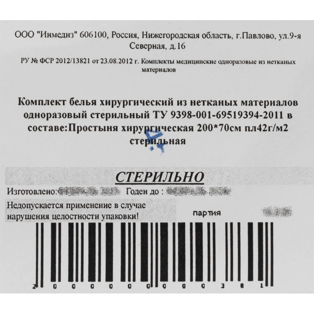 Простыня стер. 200x70 смс пл.40-42 Инмедиз