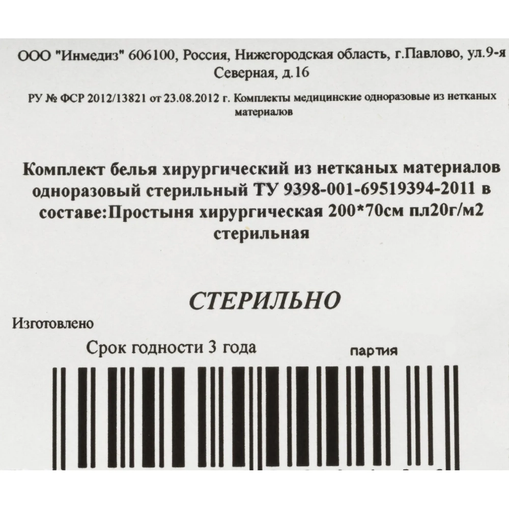 Простыня стерил. 200x70 пл.20, 1шт/уп Инмедиз