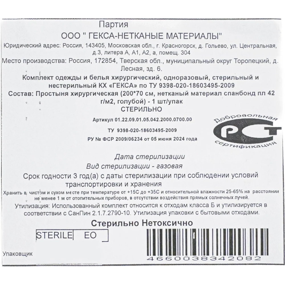 Простыня стерил. 200x70см спанбонд пл.42, голубая, 1шт./уп Гекса