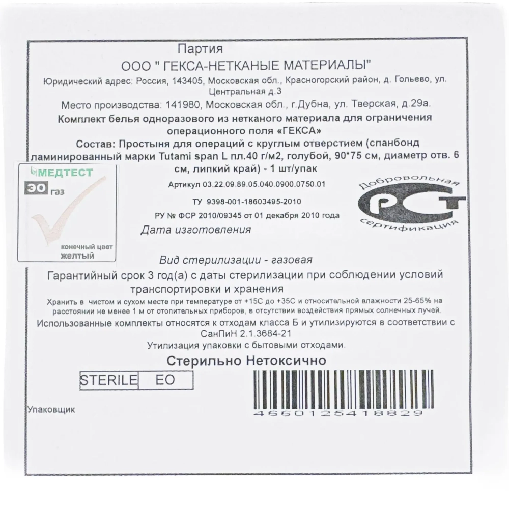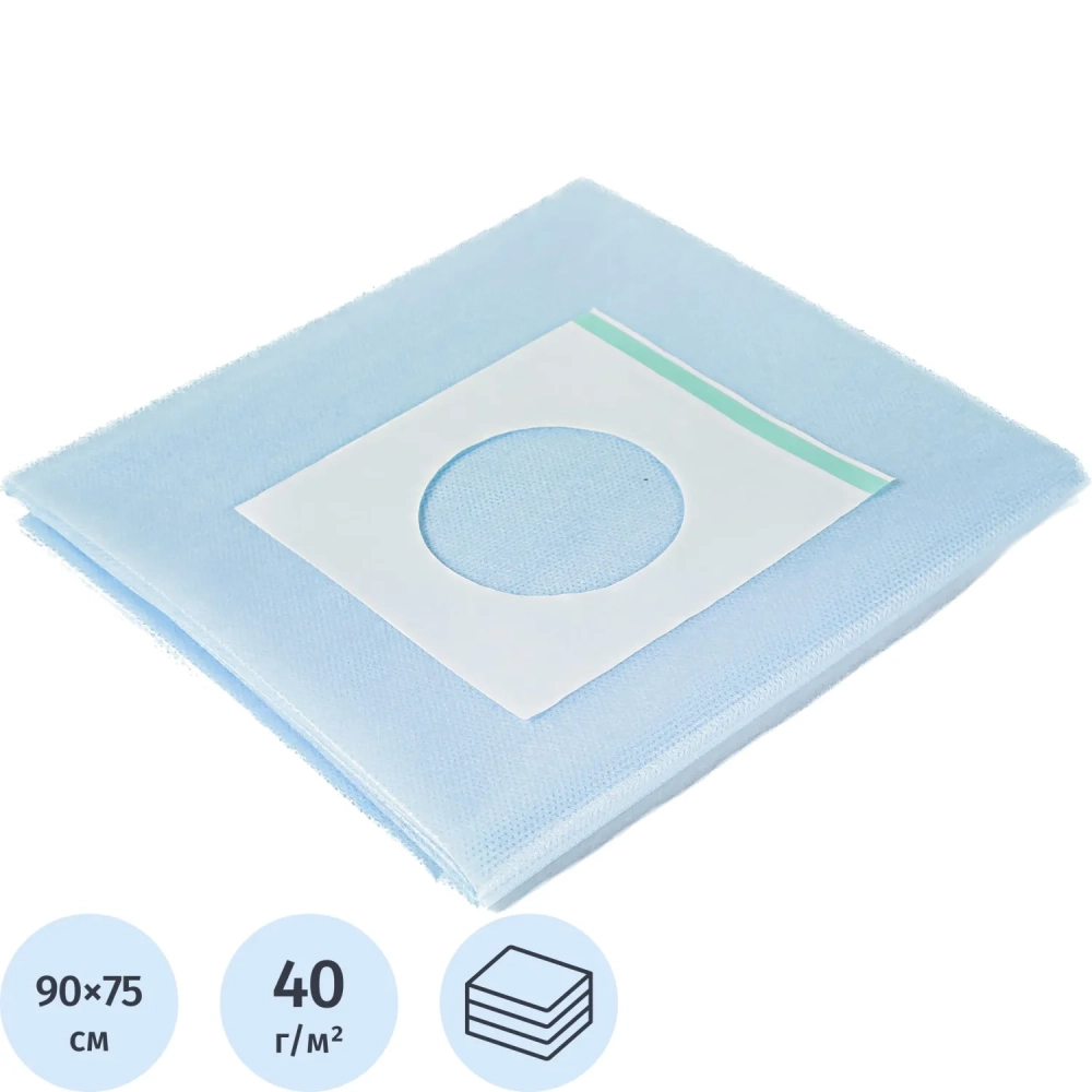 Простыня стерил. с круг.отверст. лип.край 90х75, спанб. лам., пл.40 Гекса