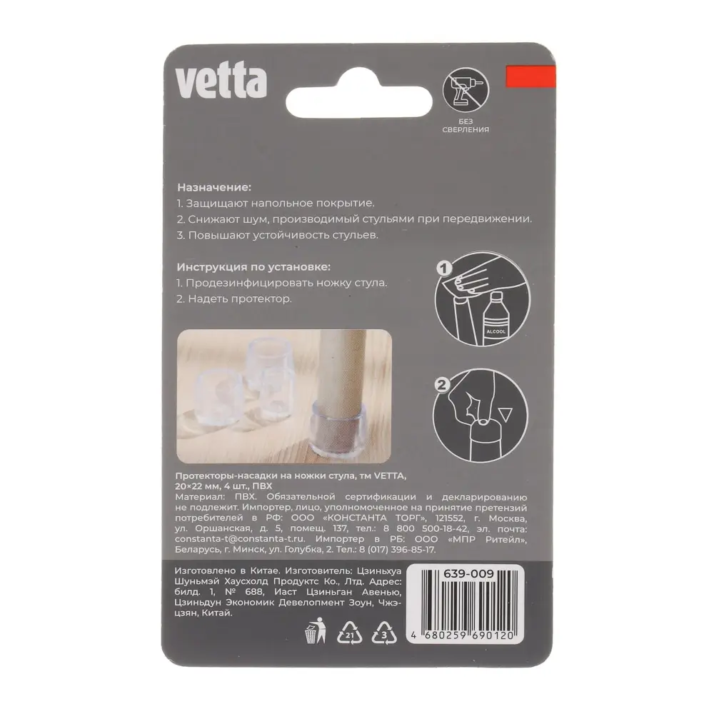 Хотите сохранить напольное покрытие в идеальном состоянии? Начните со стульев! Протекторы-насадки на ножки стульев VETTA из ПВХ идеально подходят для защиты пола от царапин и не портят внешний вид мебели, плотно надеваются и не спадают. Не подвержены быстрому износу. Размер насадки 20х22 мм, 4 шт. в упаковке.
