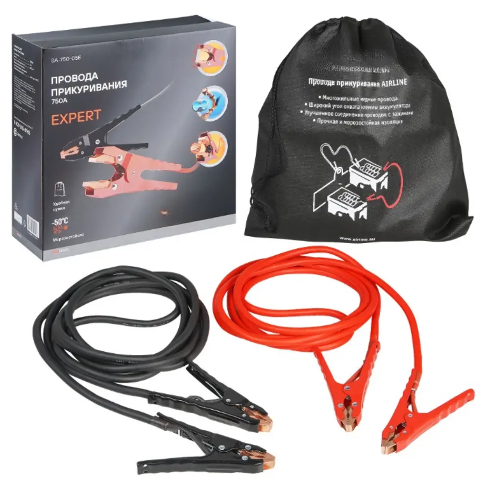 Провода прикуривания AIRLINE EXPERT разработаны инженерами нашей компании и предназначены для запуска двигателей легковых и грузовых автомобилей, а также спецтранспорта с разряженной аккумуляторной батареей. Многожильный провод длиной 5 м позволяет использовать провода для любого коммерческого транспорта, а "плавающие крокодилы" с максимальной площадью "зубов" и технологией двойного контакта 2х2 позволят передать энергию с минимальными потерями. Преимущества проводов прикуривания 750 А : 1. Плавающие крокодилы - позволяют максимально плотно охватить любую клемму аккумулятора или любую металлическую поверхность.2. Максимальная площадь контакта – крокодил контактирует с клеммой АКБ всей поверхностью, а не только 'зубами' 3. Технология двойного контакта 2х2.